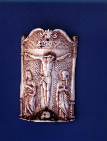 Plaque d'ivoire, incurvée, sculptée en bas-relief, le fond amati par gravure (réseau orthogonal oblique, irrégulier)