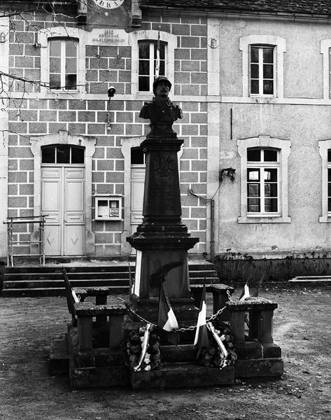 Buste de poilu au sommet de l'obélisque, croix de guerre et palme sur la face principale.