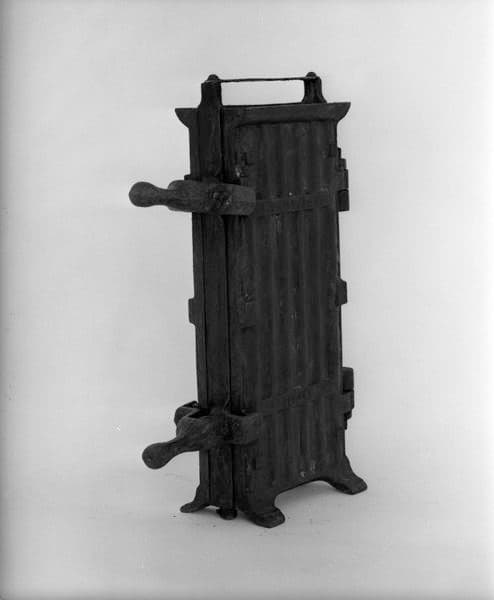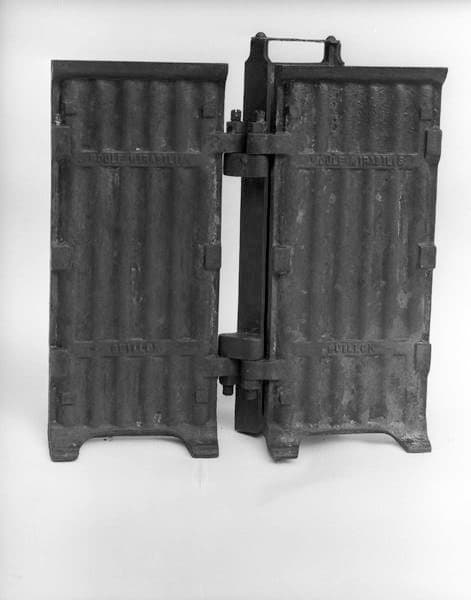 Moule à 12 matrices composé de 3 plaques assemblées par 4 gonds : une plaque interne et deux plaques externes ; les deux plaques externes sont creusées de 6 demi-formes à cierge, la plaque centrale est double face ; les deux plaques externes comportent chacune deux pieds pour assurer une position verticale, la plaque intermédiaire est munie d'une poignée en acier, vissée ; fermeture par 2 manetons pivotant, en étau sur la tranche