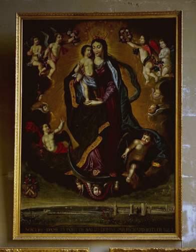 inscription en bas de la toile : NOSTRE DAME DE PORT DE SALUT. DONNE PAR RICHARD BUTLER 1664 ; armoiries identifiées du donateur : de sinople au chevron d'or accompagné de trois coupes couvertes du même