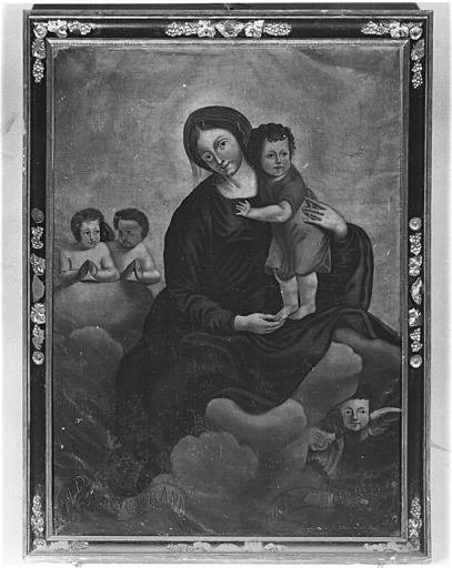 description : la Vierge est assise sur un nuage, entourée de 2 anges et de 2 angelots ; l'enfant se tient debout sur le genou de la Vierge