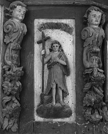 bois : peint (polychrome), décor en bas-relief, décor en demi-relief