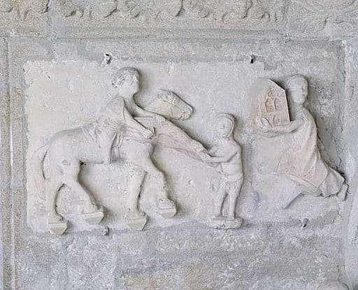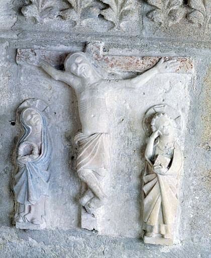 scène biblique (Crucifixion) ; scène (saint Martin, manteau) ; figure