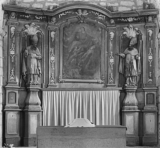 Retable à trois travées surmontées d'un entablement cintré en son milieu ; l'entablement était autrefois surmonté de quatre statues d'anges (voir dossier pendants)