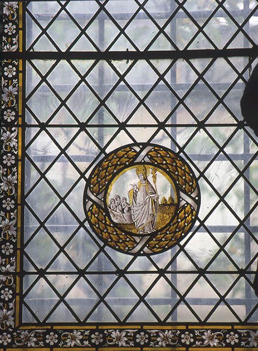 5 rondels de l'extrême fin du 15e siècle et du début du 16e siècle ont été remontés dans une vitrerie losangée des 19e et 20e siècles