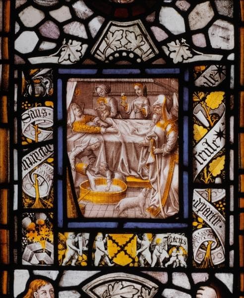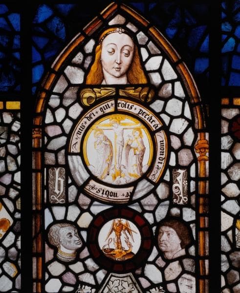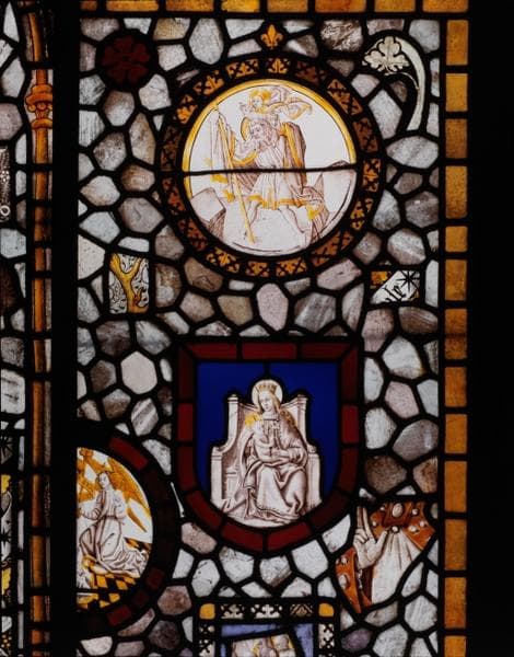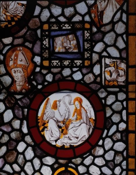 POP | Plateforme ouverte du patrimoineverrière (verrière historiée, verrière figurée) : Nativité de la Vierge, Annonciation, calvaire, scènes historiques non identifiées, Vierge à l'Enfant, sainte Madeleine, saint Michel, saint Christophe, numéro d'inventaire : 87 GHD 387 2