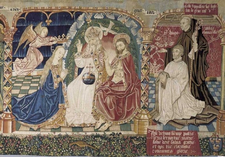 Tenture de choeur de la fin du 15e siècle (datée 1500 sur la 5e pièce) dont les modèles sont inspirés de gravures largement diffusées par l'imprimerie apparue vers 1475. En 1474, le chapitre de Beaune avait passé avec Pierre Spicre, peintre demeurant à Dijon un marché concernant ' les patrons des histoires de Nostre Dame ' sur lesquels devait être représenté le cardinal Jean Rolin. On ne sait si la tapisserie offerte par l'archidiacre Hugues Le Coq 25 ans plus tard, fut réalisée à partir des cartons de Pierre Spicre. A. Humbert a fait restaurer les pièces (laver, redoubler) par les soeurs de l'Hôtel-Dieu en 1852. Les dernières interventions conservatoires ont été réalisées entre 1993 et 1995 par Martine Plantec, conservateur-restaurateur textile à LP3 Conservation.