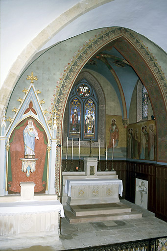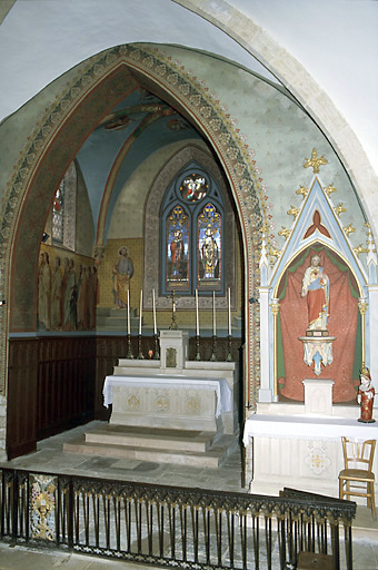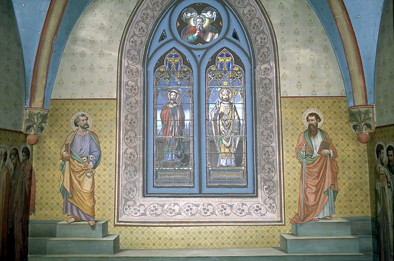 Arc triomphal : motifs végétaux et géométriques. Voûtains : sur un fond bleu étoilé, les quatre évangélistes et leurs symboles. Mur Est : saint Pierre et saint Paul, de chaque côté de la baie. Mur Nord : les apôtres. Mur Sud : les pères de l'Eglise Latine (saint Augustin, saint Ambroise, saint Jérôme) et les pères de l'Eglise d'Orient (saint Basile, saint Grégoire de Naziance, saint Athanase, saint Cyrille et saint Irénée).