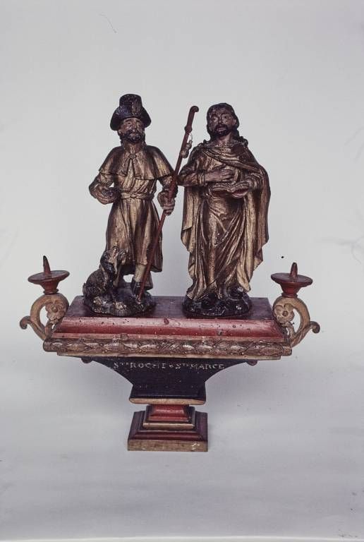 saint Roch : pèlerin, chien, bâton, chapeau, pain ; saint Marc : livre
