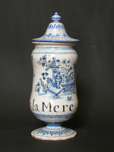 Pots sur piédouche à couvercle ; décor en camaïeu bleu, inscriptions peintes en violet foncé ou noir.