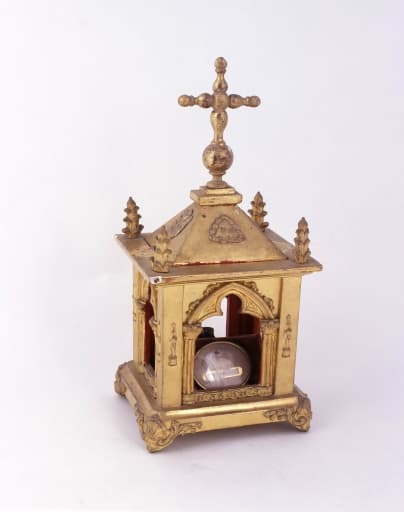 Châsse reliquaire carrée, vitrée sur les 4 faces ; la châsse contient des petites reliques dans un médaillon. Inscription : saint Benoit martyr.