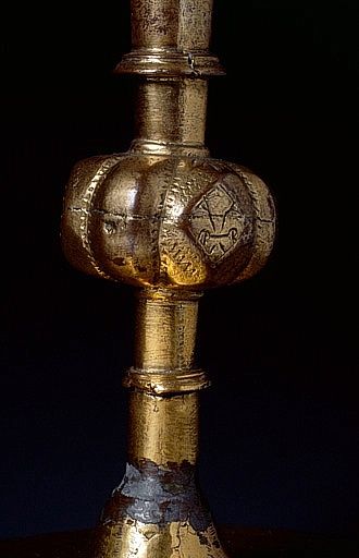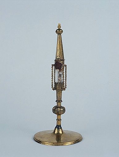 Manquent la croix sommitale et les quatre pinacles cantonnant le fût en cristal, ces derniers étant remplacés par les chaînettes actuelles ; soudure de restauration visible à la base de la tige.