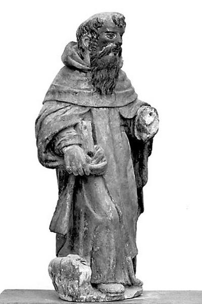 Saint Antoine, debout, âgé, barbu, jambe droite fléchie, porte sous son bras droit un livre et retient un pan de son manteau ; à sa droite un cochon ; une couronne de cheveux ceint son crâne ; il est vêtu d'une bure serrée à la taille par une cordelette, d'un manteau à capuche, de chaussures à bout carré.