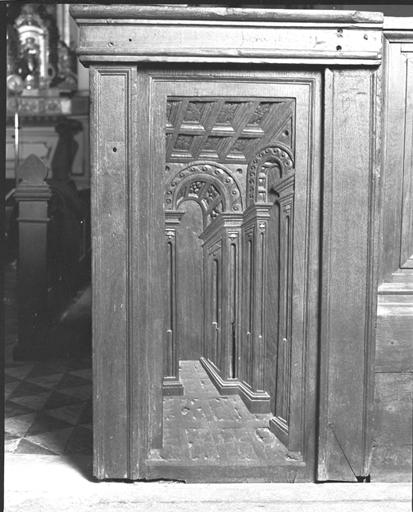 Les côtés des stalles sont ornées de vues d'intérieur traitées en perspective. Elles sont constituées d'arcades en plein cintre, de plafonds, de voûtes en berceau à caissons. Des fleurs stylisées ornent les écoinçons et les voûtes.