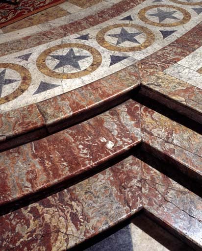 Les degrés d'accès au sanctuaire et au maître-autel sont en marbre rouge du Languedoc. Au-dessus des trois premiers degrés, la large bande qui fait le tour du sanctuaire est en brèche d'Alep, elle est encadrée de fines bandes de marbre blanc veiné noir. Au centre du sanctuaire, le dessin consiste en une frise de grandes étoiles et au centre, une rose des vents. Le pied du maître-autel est également en brèche d'Alep. Le sol de la partie rectiligne du choeur consiste en une alternance de dalles de marbre blanc ou noir dessinant un échiquier.