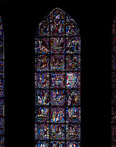 Verrière contemporaine de la cathédrale actuelle reconstruite après l'incendie de 1194. Selon la chronologie traditionnelle, elle peut être datée entre 1210 et 1225 et fut offerte par la gilde des boulangers.