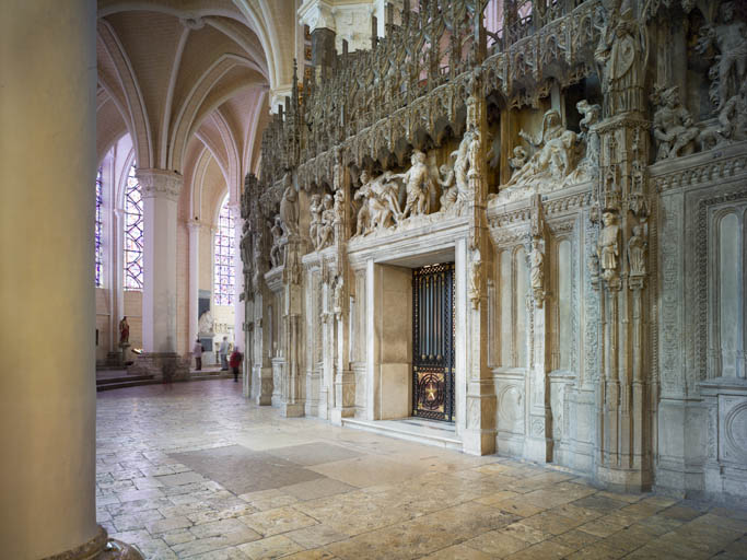 Le Tour du choeur constitue une véritable muraille de pierre sculptée. Il se dresse à plus de six mètres de hauteur en s'adossant aux piles et colonnes de l'édifice et se développe sur une centaine de mètres, enserrant la totalité du choeur qui n'est accessible que par la croisée du transept et les deux portes latérales ouvrant sur le déambulatoire. La construction autorise la lecture architecturale verticale et horizontale qui s'effectue traditionnellement du sud au nord en suivant l'ordre narratif des grandes scènes religieuses. En élévation, la clôture se trouve clairement rythmée par les contreforts massifs qui renforcent les supports du 18e siècle et portent des statues d'ecclésiastiques, et par des contreforts plus légers où se superposent plusieurs étages de statuettes. Sur le plan horizontal, quatre niveaux se succèdent : le soubassement formant mur de soutènement habillé de faux fenestrages et de médaillons, l'ancienne claire-voie ornée dans les deux premières travées nord et sud d'un sobre décor médiéval, puis d'un répertoire luxuriant d'ornements décoratifs Renaissance qui s'épanouit sur les pilastres, meneaux et corniches. Au-dessus, la galerie déroule sa succession de niches dans lesquelles s'inscrivent les grands groupes sculptés. L'ensemble est couronné par des dais d'architecture habités de petits personnages et d'animaux fabuleux.