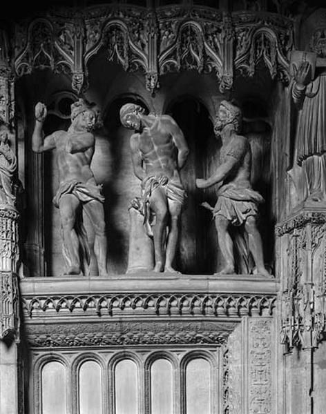 Le 23 novembre 1712, un donateur offre une somme importante pour exécuter une Flagellation composée de trois personnages. Au début de l'année suivante, le modèle est présenté et le groupe est mis en place dans la première section de la douzième travée, au droit de la pile gauche. Le 9 janvier 1715, il est déplacé à la onzième travée, où il se trouve maintenant, et remplacé par le Couronnement d'épines, épisode plus proche de la Crucifixion.