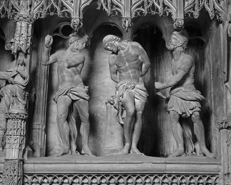 Sources littéraires : Bible, Evangiles de Matthieu 27, 27-31, Marc 15, 16-20, Luc 23, 16 et 22 et Jean 19, 1. Le Christ au centre attaché à une colonne est frappé alternativement par les soldats.