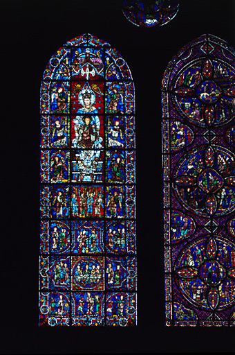 Lancette gauche (Notre-Dame de la Belle-Verrière) verrière composée en étoile à cinq panneaux et demi-médaillons dans les trois registres inférieurs, puis panneaux carrés ou rectangulaires, bordure à palmettes libres ou dans des cercles ; lancette droite composée de trois grands cercles divisés en cinq panneaux, demi-quadrilobes latéraux, mosaïque à résille oblique, bordure à feuillages en arceaux.