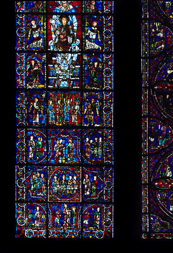 Verrière contemporaine de la cathédrale actuelle reconstruite après l'incendie de 1194, en incluant la figuration plus ancienne de Notre-Dame de la Belle-Verrière (vers 1180). Selon la chronologie traditionnelle, elle peut être datée entre 1215 et 1220.