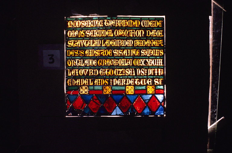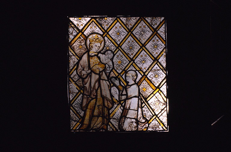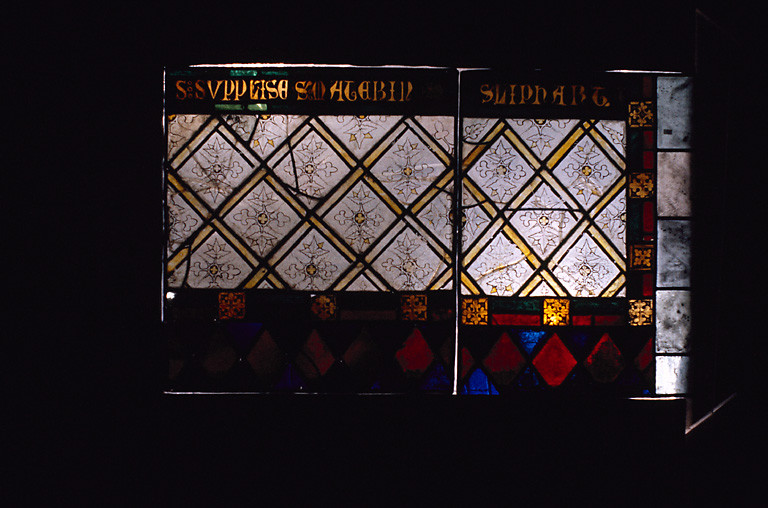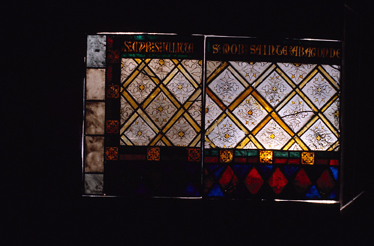 Verrière composée au registre inférieur de panneaux rectangulaires, au-dessus de trois quadrilobes à cinq panneaux, demi-cercles latéraux, mosaïque à résille oblique, fermaillets, première bordure à feuillages, deuxième à losanges.
