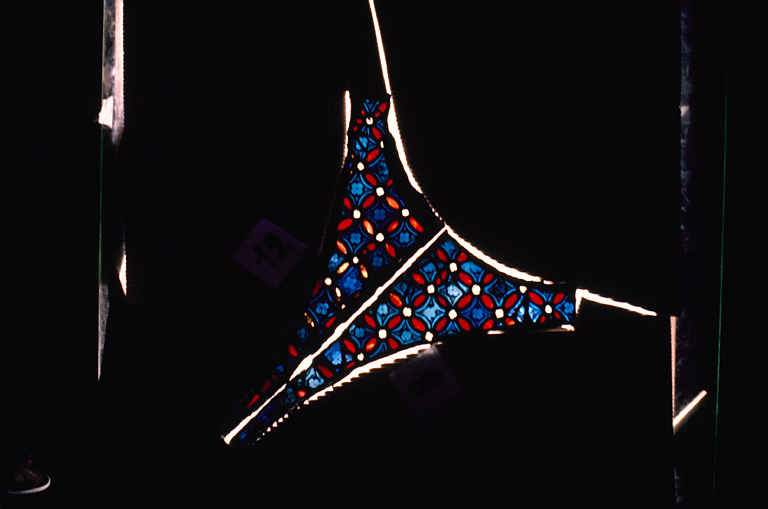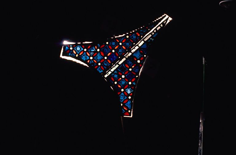 Verrière composée de quadrilobes à cinq panneaux dans des cercles, rinceaux dans les écoinçons, demi-médaillons latéraux, mosaïque à disques, bordure de feuillages et grappes.
