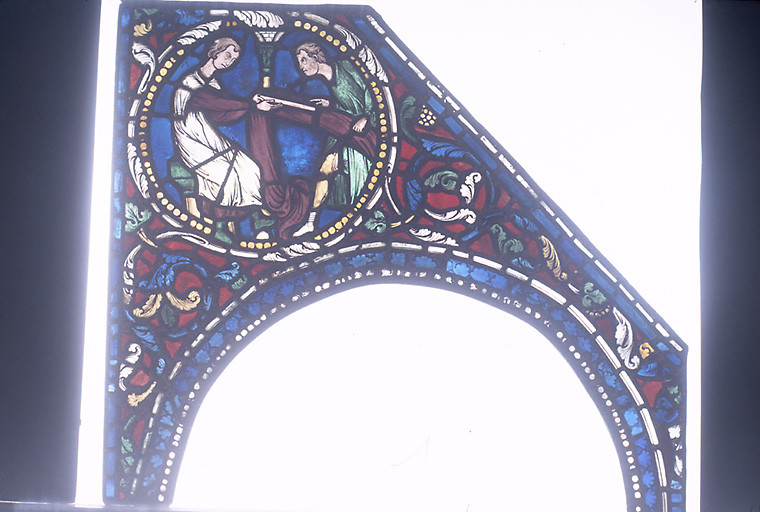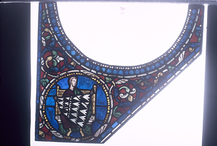 Verrière composée de dix registres de losanges et médaillons, petits médaillons dans les écoinçons, fond de rinceaux, bordure de rosaces, entrelacs et feuillages.