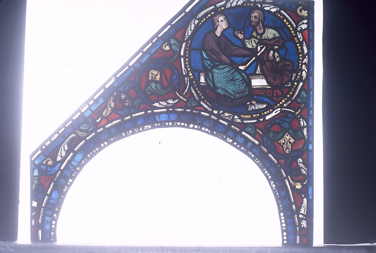 Verrière contemporaine de la cathédrale actuelle reconstruite après l'incendie de 1194. Selon la chronologie traditionnelle, elle peut être datée en 1210.