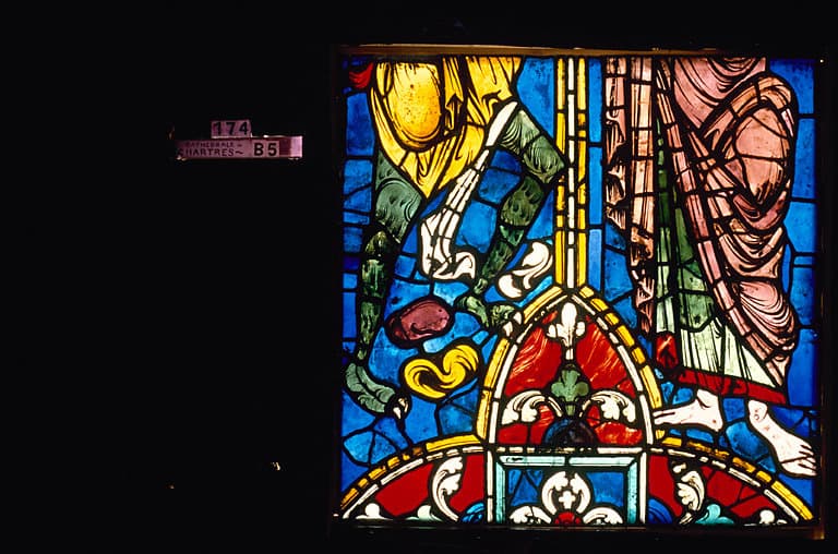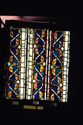verrière figurée : Trois prophètes, Tentation du Christ, Saint évêque entre deux donateurs (baie 141)