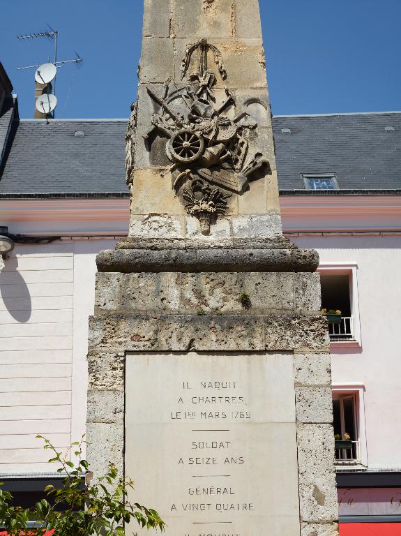 Inscriptions sur les quatre plaques de l'avant à dextre : "A MARCEAU/ LA VILLE DE CHARTRES/ PAR LES SOINS DE J.F. DELAISTRE/ PRÉFET/ D'EURE ET LOIR/ V. CHEVARD/ MAIRE/ Ier VENDÉMIAIRE AN X/ IIe ANNÉE/ DU CONSULAT/ DE BONAPARTE" ; "Il NAQUIT/ À CHARTRES / LE 1er MARS 1769/ SOLDAT/ À SEIZE ANS/ GÉNÉRAL/ À VINGT-QUATRE/ IL MOURUT/ À VINGT-SEPT" ; " ARMÉE/ DE L'OUEST/ VII FRIMAIRE AN II/ X NIVÔSE AN II/ ARMÉE/ DES ARDENNES/ XXV GERMINAL AN II/ ARMÉE/ DE SAMBRE ET MEUSE/ XV MESSIDOR AN II" ; "BLESSE MORTELLEMENT/ À HOETSBACH/ IL EXPIRA/ ALTENKIRCHEN/ LE IVe JOUR/ COMPLÉMENTAIRE AN IV/ LES GÉNÉRAUX AUTRICHIENS/ RENVOYÈRENT SON CORPS/ À L’ARMÉE FRANÇAISE/ ET LUI RENDIRENT/ LES HONNEURS FUNÈBRES/ DANS LEUR CAMP".