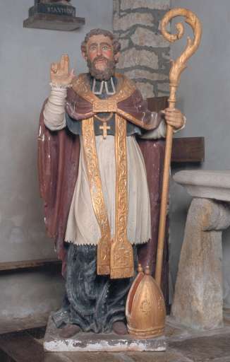 Saint Eloi est représenté en évêque, la mitre à ses pieds.