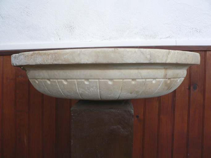 Le pied d'origine en marbre est manquant. Il a été remplacé par un fût maçonné de plan carré. Quelques épaufrures sur la cuve dont une partie du rebord, cassée, a été refaite au ciment.