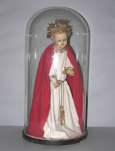 Statuette de l'Enfant Jésus en cire moulée peinte au naturel, fixée sur un socle en bois et présentée sous un globe en verre. L'Enfant Jésus est revêtu d'une tunique de tissu blanc dont le col et les manches sont garnis de dentelle mécanique en fil de métal doré, et d'une cape en tissu rouge.