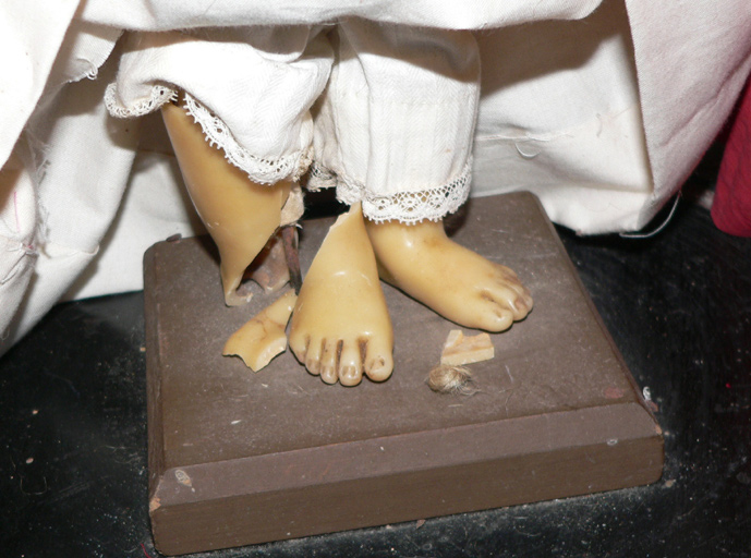 cire : moulé, peint, polychrome ; tissu uni (blanc, rouge) ; fil métal (or)