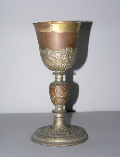 Coupe en métal repoussé et doré. Fausse-coupe en métal repoussé, ciselé et argenté. Pied et tige en métal fondu et argenté.