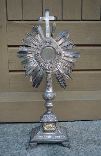 La Trinité et l'Agneau mystique, alternant avec un décor de pampres, sont représentés sur le pied. Le noeud est orné de pampres et de fleurs. Quatre chérubins et des épis de blé figurent sur la gloire.