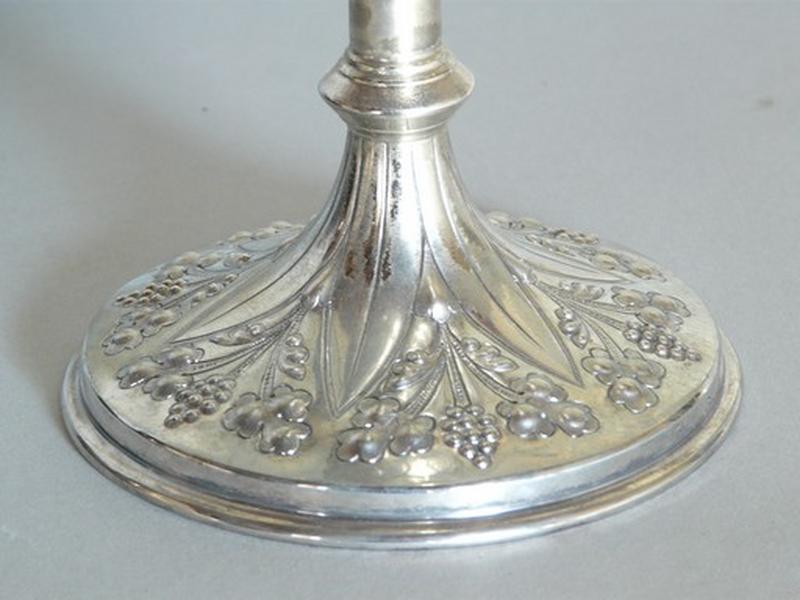 Poinçon garantie gros ouvrages 1er titre Paris 1838-1973, et poinçon de maître : P, une mitre, B (Paul Brunet), insculpés sur la coupe, le couvercle et le pied. Inscription concernant le donateur et date en lettres majuscules estampées sur le carré du pied : OEUVRE.DES.TABERNACLES.1883.
