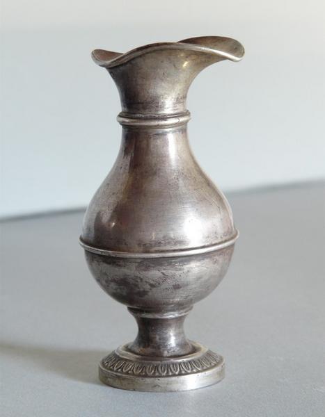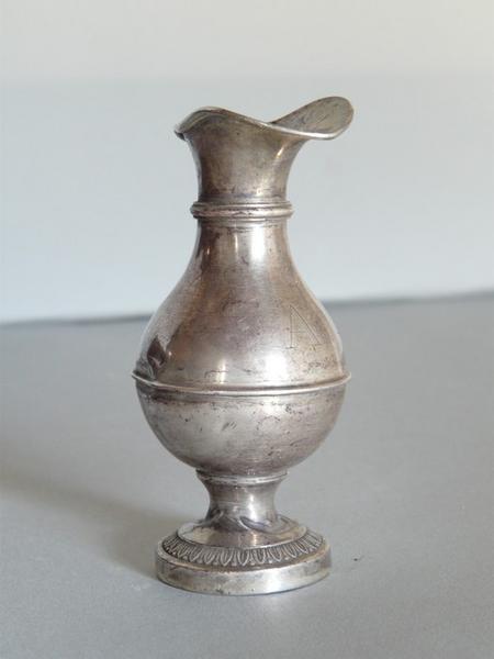 Ensemble de deux burettes réalisées par Jean-Alexandre Chertier, orfèvre parisien actif de 1857 à 1890, comme l'attestent les poinçons portés sur les oeuvres. Elles pourraient correspondre aux 'deux burettes argentées', don de l'abbé Antonietti, mentionnées sur l'inventaire des biens de la fabrique paroissiale d'Azzana dressé le 20 novembre 1906 par le percepteur Folacci (A.D.2A : fonds non classé des Domaines). Plateau à burettes rapporté, non étudié.