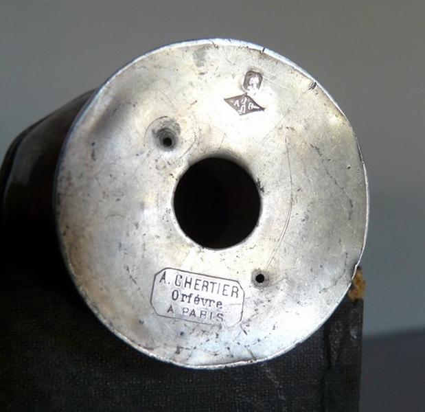 Poinçon garantie et titre argent Paris depuis 1838 insculpé sous le pied et sur le bec de chaque burette. Poinçon de maître accompagné d'une marque d'auteur portés sous le pied des deux burettes : A, un charretier fouet à la main, C (Jean-Alexandre Chertier), et : A.CHERTIER/ Orfèvre/ A PARIS. Inscription gravée sur la panse de la burette à eau : A[QUA], et sur la panse de la burette à vin : V[INUM].