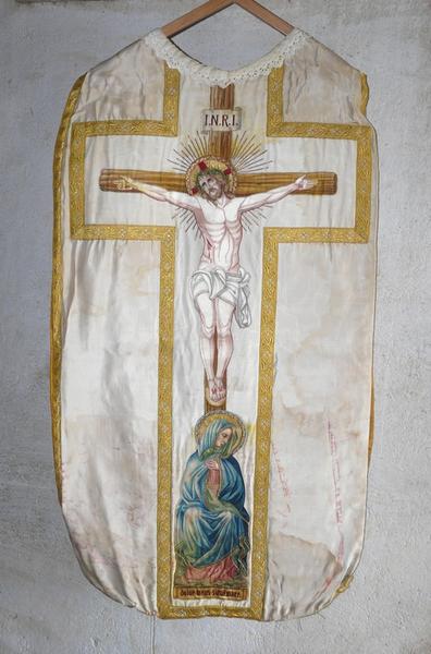 Représentation du Christ en croix et de la Vierge de douleur sur l'orfroi dorsal, et du Christ ressuscité sur l'orfroi de devant.