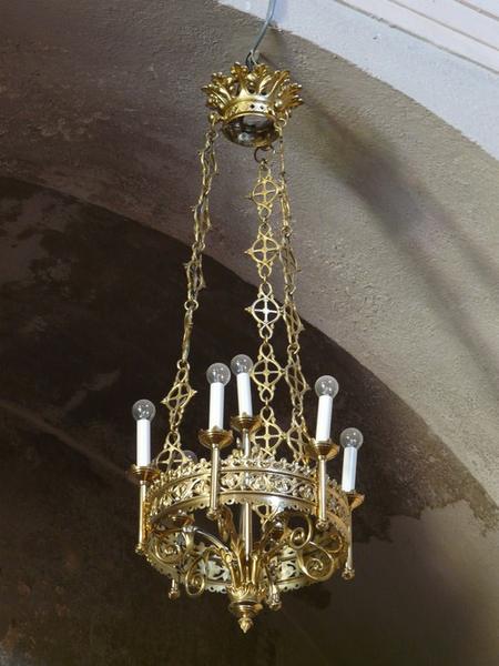 Ensemble de deux lustres circulaires suspendus en métal fondu et doré, formés d'une armature à six branches portant une couronne de lumières sur laquelle sont fixées six bougies. Trois chaînes de suspension.