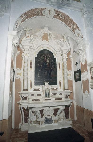 Autel tombeau maçonné, précédé de deux degrés et surmonté de trois gradins d'élévation galbée, enserrant un tabernacle. Retable architecturé, à fronton chantourné, comprenant quatre colonnes encadrant une contre table cintrée à oreilles.
