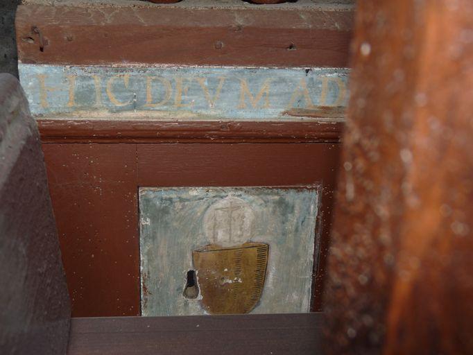 Dédicace en latin peinte sur la frise de l'entablement et sur la partie inférieure : HIC DEUM ADORA (Ici adore Dieu) et EGO SUM PANIS VIVUS (Je suis le pain vivant).