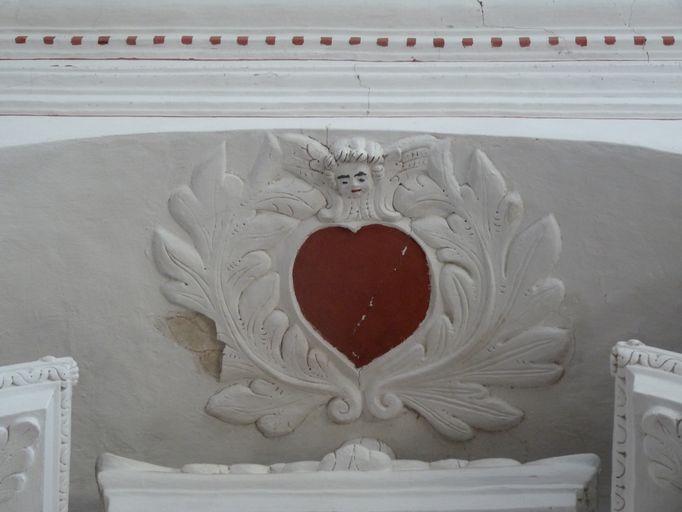 Cornes d'abondance encadrant un coeur, sur la face antérieure de l'autel ; cartouche rocaille, coeur, chérubin, anges sonnant de la trompette, sur le retable.