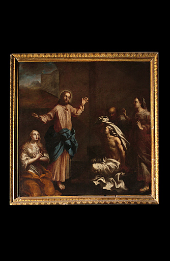 Ces deux tableaux, la Résurrection de Lazare et celle du Christ, sont de la main de l' artiste toulousaine Marguerite de Michel (1688-?) qui les a peints autour de 1737. Ces peintures font partie d' une série de tableaux relatant la Vie du Christ. Ces oeuvres sont inspirées de compositions caravagesques du 17e siècle. La Résurrection du Christ est une oeuvre composite, reprenant plusieurs modèles. La partie inférieure de la compostion, avec le caveau et les soldats, est la copie partielle et interprétée d' un détail d' un tableau de Guido Reni représentant la Vierge du rosaire, oeuvre conservée à la basilique Saint-Luc à Bologne. Ce tableau du Guide comporte dans sa partie inférieure une série de médaillons évoquant des épisodes de la vie du Christ dont celui de la Résurrection. Ces détails ont vraisemblablement été gravés et diffusés en Europe par le biais de l' estampe. Bien que Marguerite de Michel se soit inspirée de ce modèle, elle réinterprète la gravure à sa façon, en modifiant quelques détails comme par exemple la position des bras des personnages. La partie supérieure de l' oeuvre reprend la position du Christ du tableau de la Transfiguration de Raphaël, conservé au musée du Vatican. Ce modèle était alors très connu et amplement copié. Le tableau de la Résurrection de Lazare semble être une composition originale de l' artiste. Néanmoins, il dérive peut-être de modèle italiens ou français du 17e siècle dont la gravure ou le tableau source n' ont pas été identifés dans l' état actuel des recherches. La gamme chromatique sombre et l' effet de clair-obscur de ces oeuvres les inscrivent parfaitement dans le style de Marguerite de Michel. Les cadres sont vraisemblablement ceux d' origine.