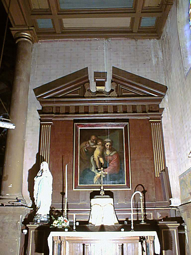 Salissures par fientes d'oiseaux sur toute la hauteur du tableau. Peinture restaurée par Mme Barthelemy. Cadre repeint, sauf les champs : écaillage des repeints. Tableau décalé à droite dans son cadre.