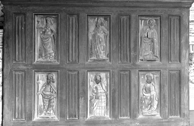 figures: en pied ; Les Apôtres ; attribut ; en encadrement: ornementation ; à plis en serviette