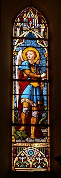 Ce vitrail représente l'archange saint Michel debout, le pied droit posé sur la tête du dragon. Il est représenté sur un fond damassé bleu et sous un décor d'architecture à tourelles.
