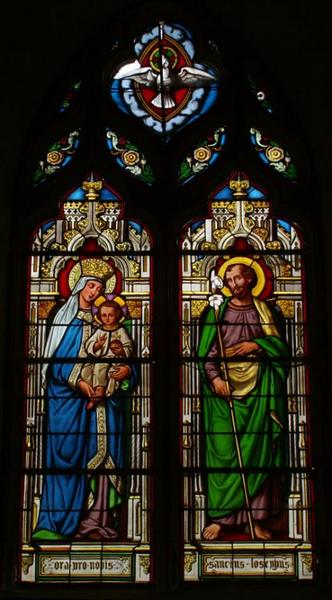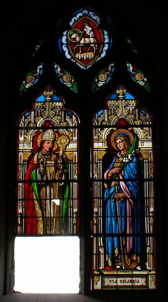 Ces quatre verrières, formant un ensemble homogène, présentent des personnages en pied sous un décor d'architecture. Sont ainsi figurés : la Vierge à l'Enfant et saint Joseph (baie 1), un saint évêque et sainte Solange (baie 2), saint Antoine l'ermite et saint Ursin (baie 3), saint Alexandre de Jérusalem et un soldat romain (baie 4).